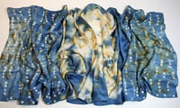 Patterns and textures have been created by rust prints and indigo on this lightweight silk habotai scarf in vibrant cool blues and warm earth browns. White patterns have been created using binding and a clamped resist technique called itajime, or clamped block resist - when the clamps are released after dyeing in the indigo vat beautiful shapes remain.