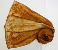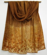Imagine yourself embraced in the golden light of summer's flowers and the soft autumn warmth of cinnamon and nutmeg. This large botanically dyed silk scarf has a sweeping band of ecoprinted coreopsis and tickseed flowers in golds and rust oranges at each end, alongside the warm spice browns of cutch. The sweet impressions of tiny flower buds are made by a humble member of the coreopsis family known commonly as tickseed and coreopsis tinctoria, or dyer's coreopsis. The play of light on this silk brings a complexity to the prints and colours that catch your eye as you move.